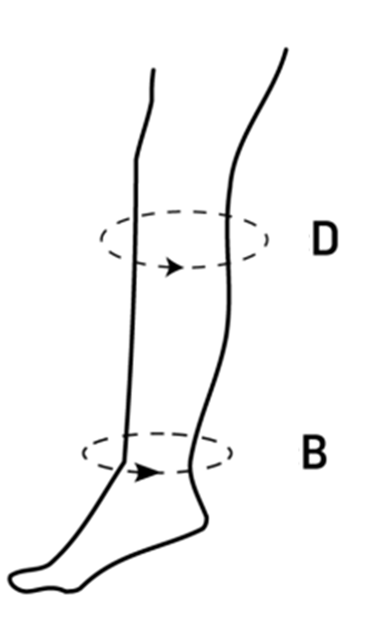 - با متر نواری دور مچ پا (B) و دور ساق پا (D) را اندازهگیری کنید.
