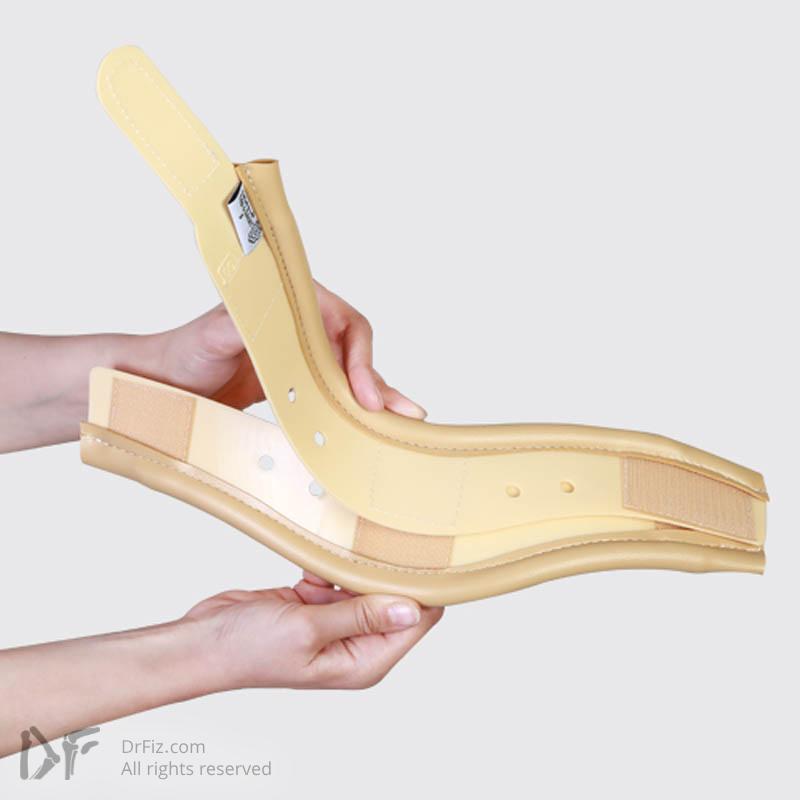 این گردنبند از پلاستیک سخت و مقاوم در کنار فوم داخلی نرم ساخته شده است. استفاده از این ترکیب سبب شده تا هم حمایت کافی از مهرهها فراهم شود و هم تماس محصول با پوست تا حد امکان راحت باقی بماند. طراحی آن سبک و مستحکم است و با وجود استحکام بالا، وزن آن به گونهای تنظیم شده که در استفاده روزمره باعث خستگی یا فشار بیش از حد نشود. سایزبندی دقیق، امکان انتخاب متناسب با شرایط فردی را فراهم میکند. این محصول از دو تکه اصلی (بخش جلویی و بخش پشتی) تشکیل شده است که با بستهای قابل تنظیم به هم متصل میشوند. این طراحی دو بخشی باعث میشود که گردن بهطور کامل از جلو و پشت ثابت نگه داشته شود و انطباق بهتری با فرم بدن ایجاد گردد.